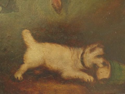 (XIX). A barn interior scene with terrier and wooden bucket, unsigned, oil on board, framed, 18 x 24 cm