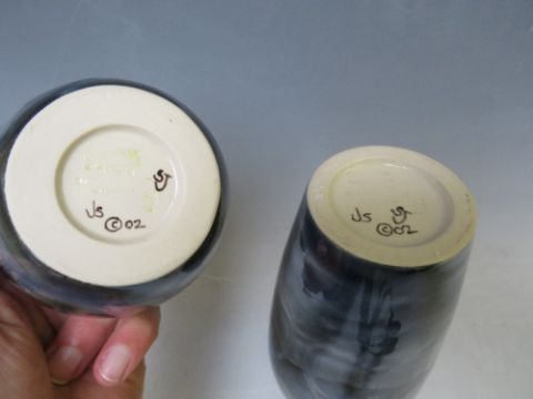 A COBRIDGE SLENDER VASE AND SQUAT VASE, both decorated with a moonlit pattern, impressed factory marks and dated '02, tallest H 20.5 cm