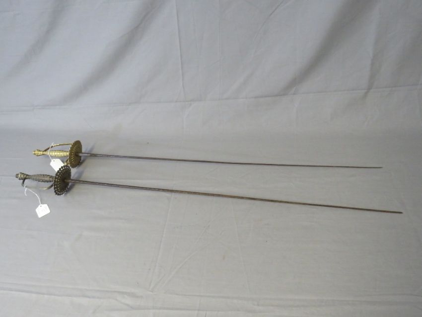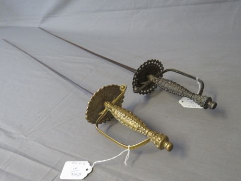 TWO RAPIER OR SPADROON STYLE SWORDS, with tapering square section blades and fancy cast hilts in the 17th century style, each approx L 104 cm (2)