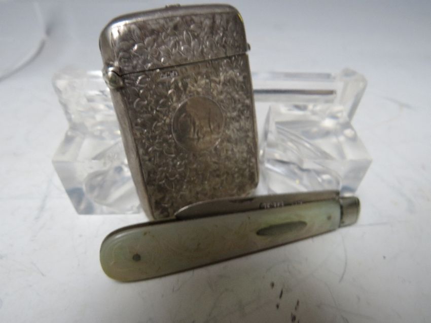 A HALLMARKED SILVER VESTA CASE, together with a silver bladed and mother of pearl fruit knife (2)
