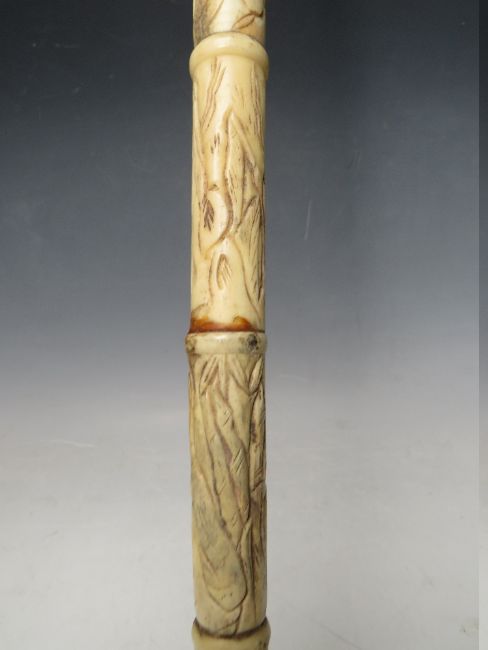 A CARVED BONE WALKING STICK WITH HORN HANDLE, overall L 92 cm