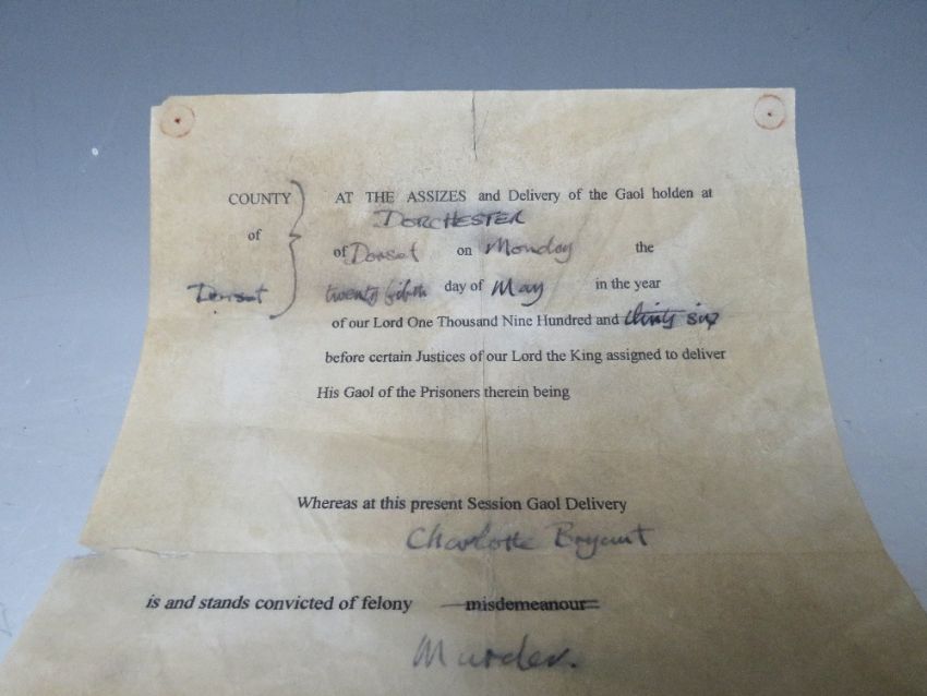 A DOCUMENT ORDERING THE HANGING OF CHARLOTTE BRYANT, NB: There is no provenance relating to this item. It was amongst a large quantity of ephemera, books and pictures etc. consigned from a deceased estate. We do not believe it to be the original document but a later copy completed by hand."County of Dorset, At The assizes and Delivery of the Gaol holden at Dorchester of Dorset on Monday the twenty fifth day of May in the year of our Lord One Thousand Nine Hundred and thirty six before certain Justices of our Lord the King assigned to deliver His Gaol of the Prisoners therein being. Whereas at this present Session Gaol Delivery Charlotte Bryant is and stands convicted of felony Murder. It is thereupon Ordered and adjudged by this Court that the above named convict be hanged by the neck untill she be dead and then her body be buried within the precincts of the Parish in which she shall have been last confined after her said conviction. By The Court Snell Clark of assize"Charlotte Bryant murdered her husband Frederick Bryant 39 by poisoning him with arsenic at Coombe, Sherbourne, Dorset on 22 December 1935. Thomas Pierrepoint was the executioner.Condition Report:NB: There is no provenance relating to this item. It was amongst a large quantity of ephemera, books and pictures etc. consigned from a deceased estate