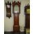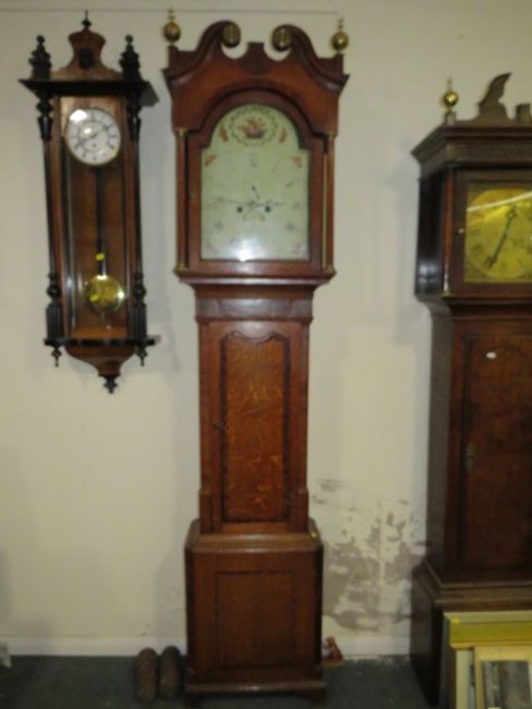 A MID 19TH CENTURY 8 DAY LONGCASE CLOCK, the oak case with mahogany crossbands and swan neck pediment, dial plat faded having floral spandrels and painted arch top, H 216 cm