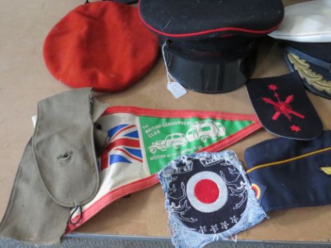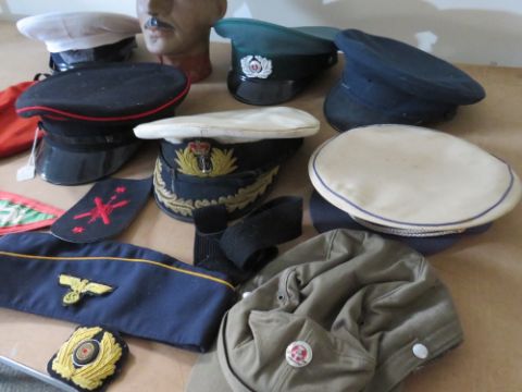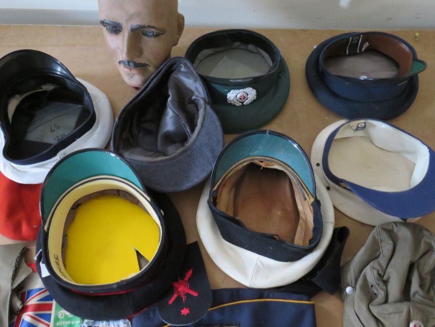 A COLLECTION OF VARIOUS MILITARY CAPS AND BERETS ETC., to include Naval and German types, along with a dummy display head etc.