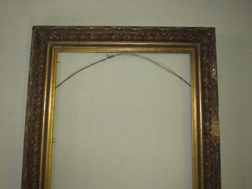 A 19TH CENTURY GOLD FRAME, with leaf design to inner edge and acanthus leaf design to outer edge, frame W 9 cm, rebate 75 x 55 cm