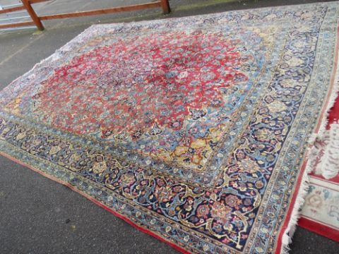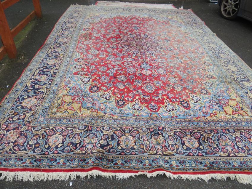 A LARGE EASTERN WOOLLEN RUG APPROX 442 x 313 cm