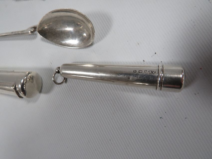 TWO HALLMARKED SILVER CHEROOT HOLDERS TOGETHER WITH A SILVER SPOON AND A HALLMARKED SILVER PENCIL (4)