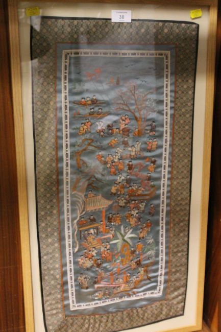 A FRAMED ORIENTAL DECORATIVE SILK PANEL