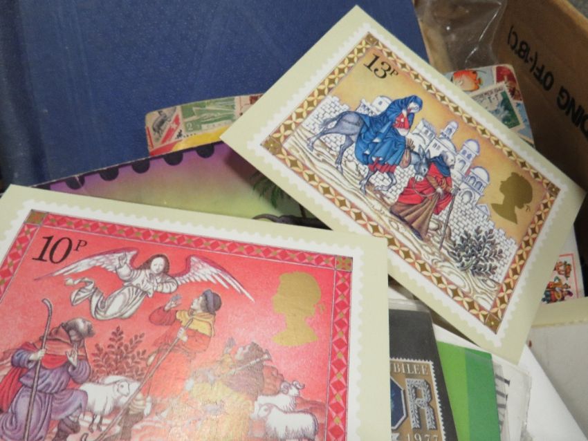 A BOX OF STAMPS AND ALBUMS WITH LOOSE STAMPS