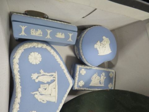 A SMALL TRAY OF WEDGWOOD BLUE JASPER WARE, BOX ORIENTAL HORS D'OEUVRES SET