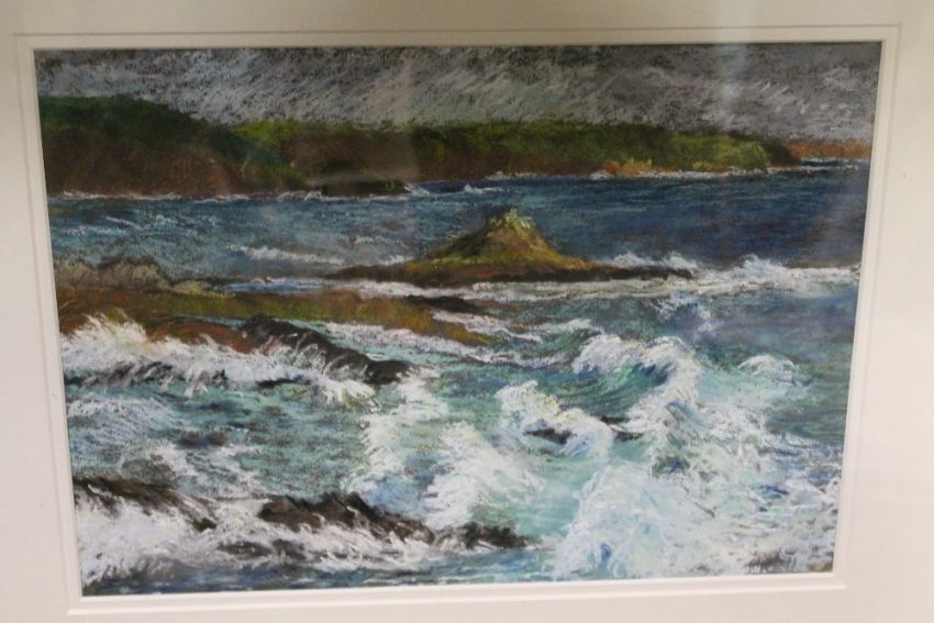 ANGELA JEWELL, 2001, A PASTEL ENTITLED 'THE ENYS & KENNEGGEY BAY WEST CORNWALL', TOGETHER WITH A DOROTHY J FITCH COLLAGE & ACRYLIC PICTURE ENTITLED 'INCOMING TIDE' (2)