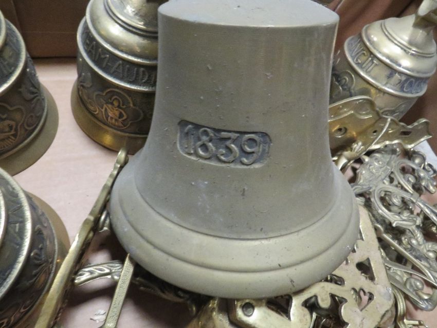 A QUANTITY OF BRASS BELLS TO INCLUDE ONE STAMPED 1839