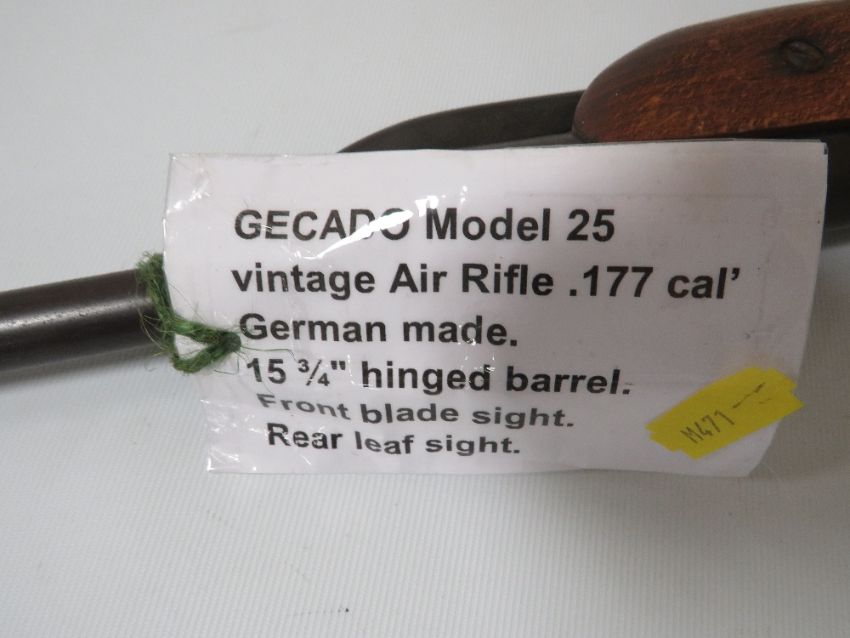 GECADO MODEL 25 VINTAGE AIR RIFLE . 177 CAL' GERMAN MADE. 15 3/4 HINGED BARREL, FRONT BLADE SLIGHT, REAR LEAF SIGHT