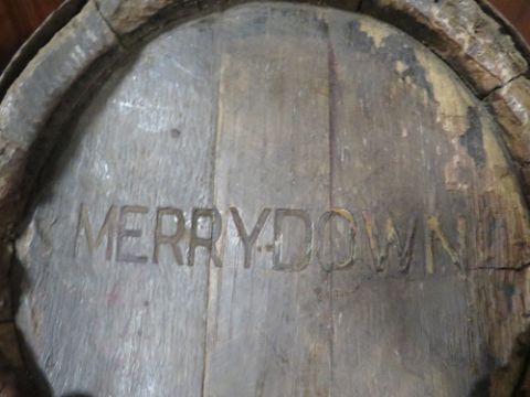 A VINTAGE SMALL COOPERED WOODEN BARREL FOR MERRYDOWN