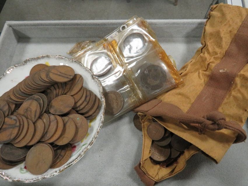 A TRAY OF ASSORTED COLLECTABLES TO INCLUDING VICTORIAN PHOTO ALBUM, COINAGE ETC