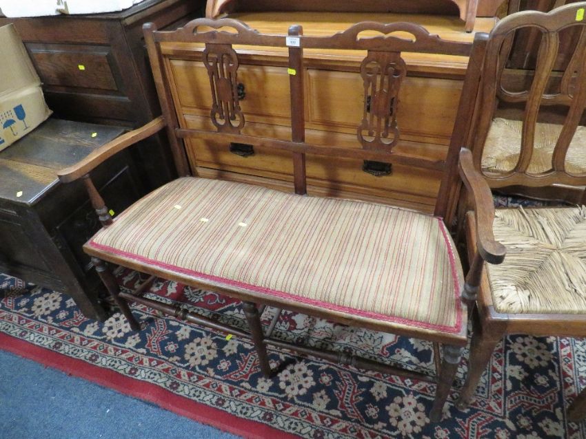 A SMALL EDWARDIAN MAHOGANY SALON SETTEE