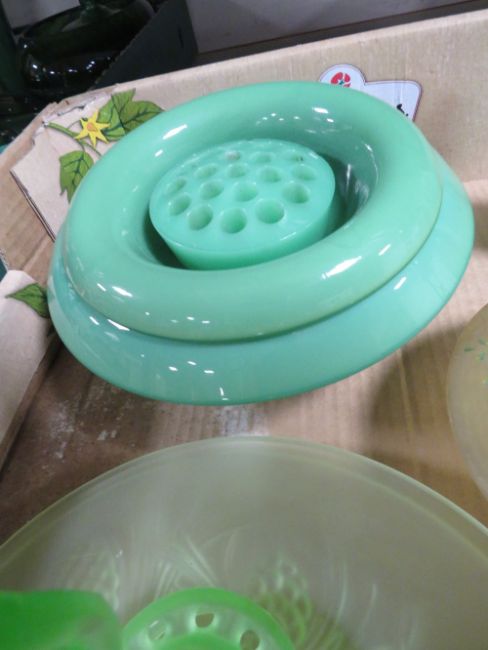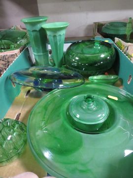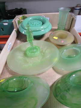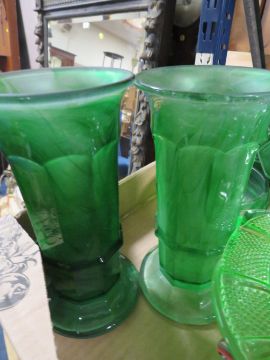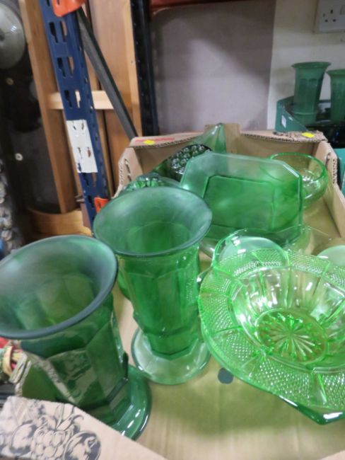 THREE TRAYS OF VINTAGE PRESSED AND OTHER GREEN GLASS