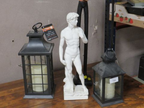 THREE ASSORTED STATUES/FIGURES AND TWO CANDLE LANTERNS (5)
