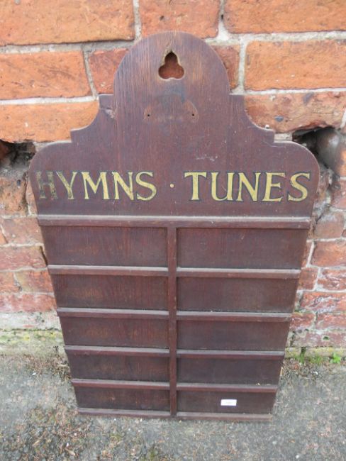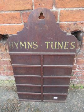 A VINTAGE ECCLESIASTICAL 'HYMNS/TUNES' OAK BOARD 88 X 52 CM