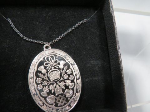 A HALLMARKED SILVER OVAL PENDANT TOGETHER WITH A PLATED EXAMPLE AND A GOLD PLATED NECKLACE (3)