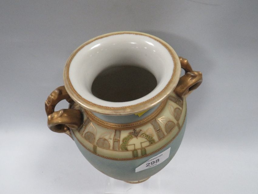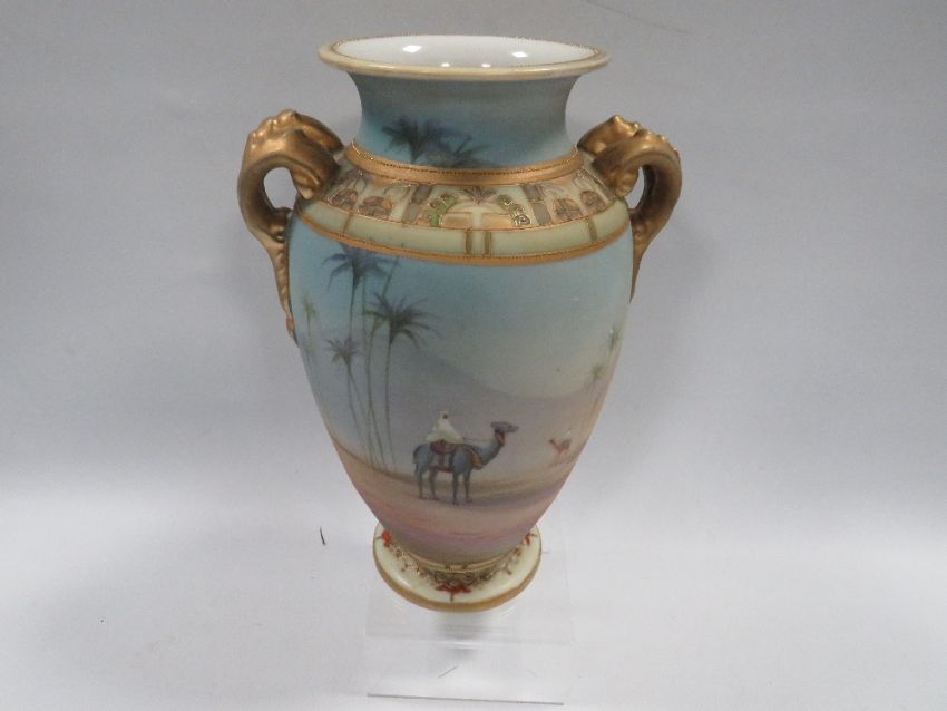A TWIN HANDLED HAND PAINTED NORITAKE VASE PAINTED WITH DESERT SCENES OF MEN ON CAMELS