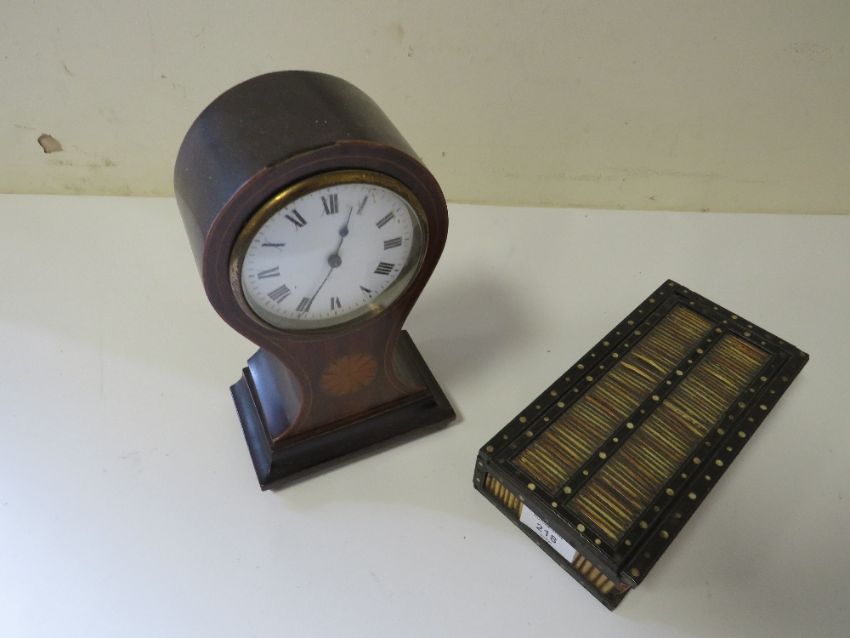 AN INLAID VINTAGE BALLOON MANTLE CLOCK TOGETHER WITH A P-O-W PORCUPINE QUILL BOX