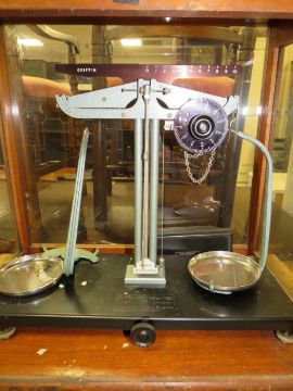 A CASED SET OF CHEMISTS SCALES WITH AN UNUSUAL CARVED FIGURATIVE BLOCK (2)
