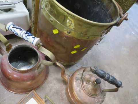 A SELECTION OF WEIGHING SCALES AND COPPER & BRASS ITEMS TO INCLUDE A PARAFFIN BLOW TORCHES ETC