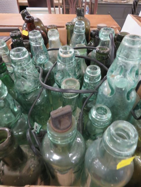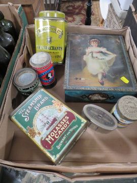 A TRAY OF ANTIQUE AND LATER GLASS BOTTLES TOGETHER WITH COLLECTABLE TIN, ART DECO STYLE MANTLE CLOCK ETC (3)