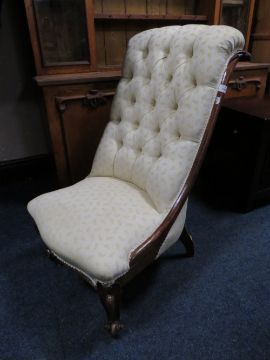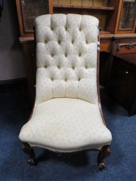 AN ANTIQUE ROSEWOOD UPHOLSTERED SLIPPER CHAIR