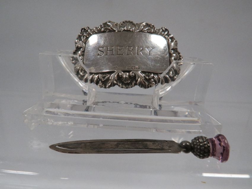 A HALLMARKED SILVER PAGE MARKER AND SILVER WINE LABEL