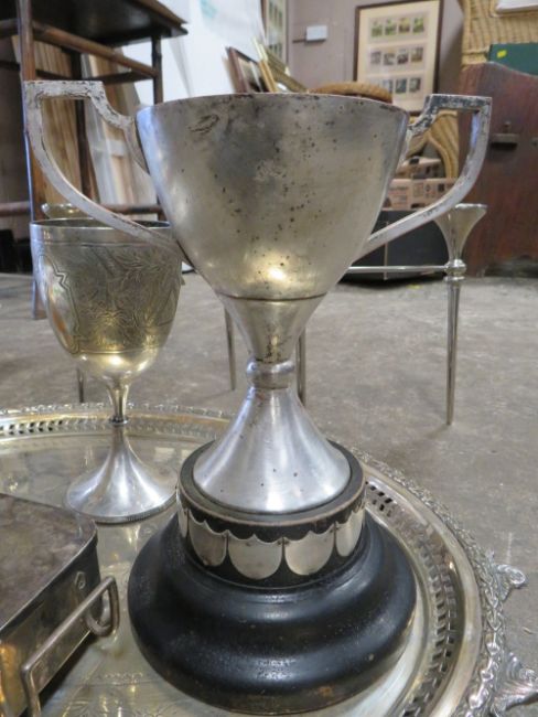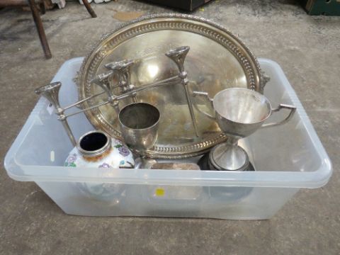 A QUANTITY OF ASSORTED SILVER PLATE AND METALWARE TO INCLUDE TWO TROPHIES, A SARDINE DISH, A LARGE SERVING TRAY / PLATTER, PLUS AN ORIENTAL ENAMEL AND WHITE METAL VASE HAVING INDISTINCT MARKS TO COLLAR