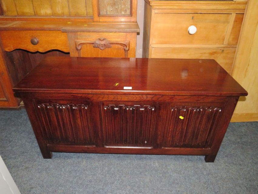 AN OAK LINENFOLD PANELLED COFFER W-113 CM