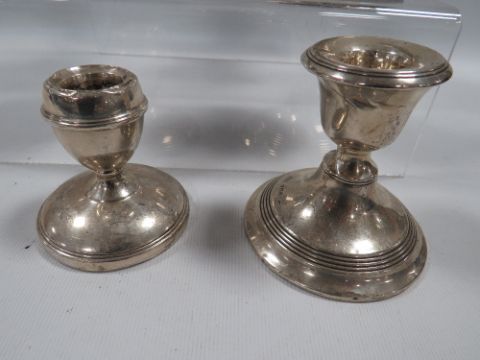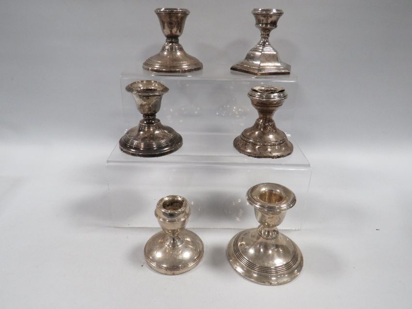 SIX ASSORTED HALLMARKED SILVER SQUAT CANDLESTICKS VARIOUS DATES AND MAKERS A/F