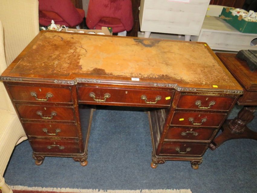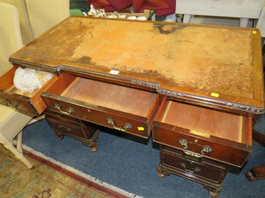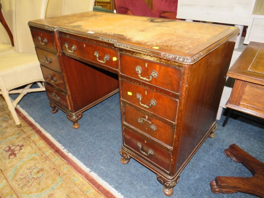 A MAHOGANY TWIN PEDESTAL DESK WITH INSET LEATHER TOP - W 121 CM A/F