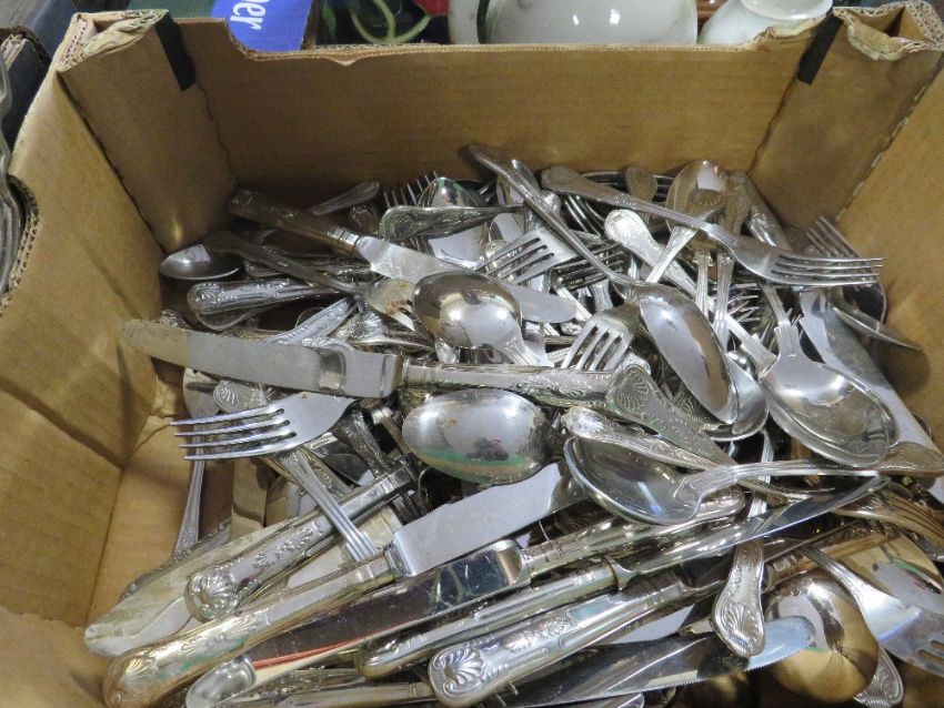 TWO TRAYS OF ASSORTED METAL WARE TO INCLUDE KING'S PATTERN CUTLERY ETC