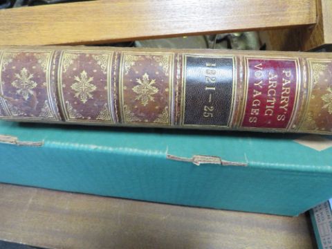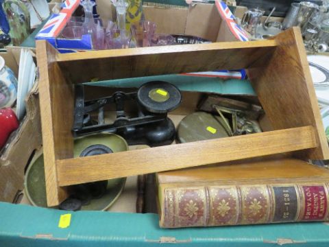 A SMALL TRAY OF ASSORTED METAL WARE TO INCLUDE A WALL MOUNTED ELEPHANT GONG TOGETHER WITH ONE VOLUME OF PARRY'S ARCTIC VOYAGE 1821 -1825