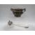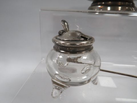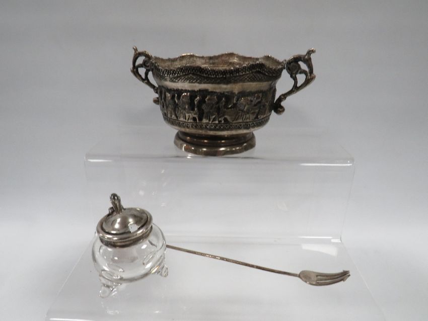 A HALLMARKED SILVER TOPPED GLASS MUSTARD POT ALONG WITH AN EASTERN WHITE METAL TWIN HANDLED BOWL AND PICKLE FORK MADE FROM INDIAN SILVER COINS