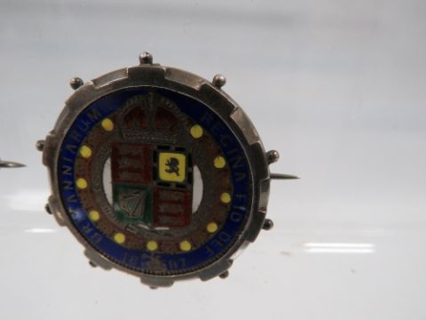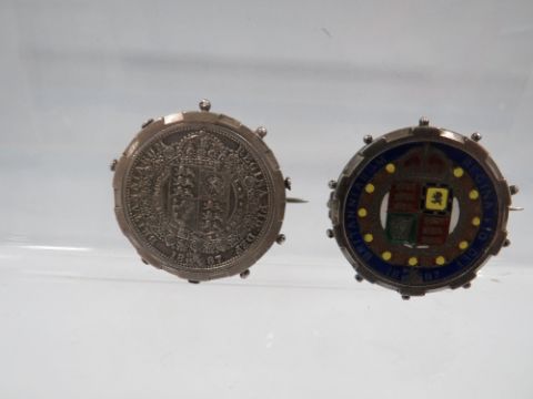 A SILVER AND ENAMEL 1887 HALF CROWN BROOCH AND SILVER 1887 HALF CROWN BROOCH