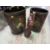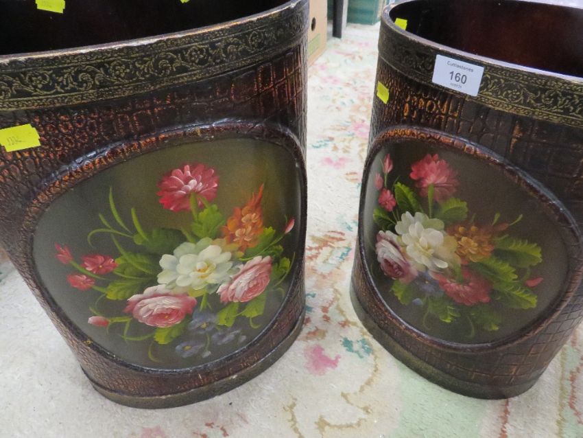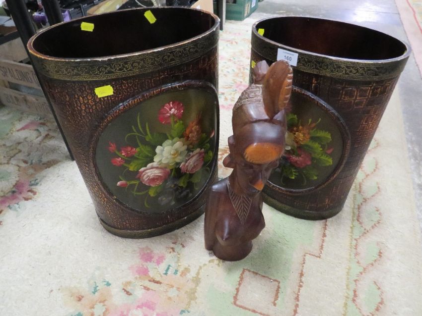 TWO HAND-PAINTED FLORAL WASTE PAPER BINS TOGETHER WITH A CARVED AFRICAN STYLE STATUE