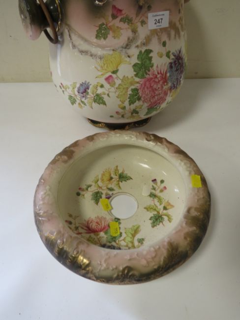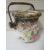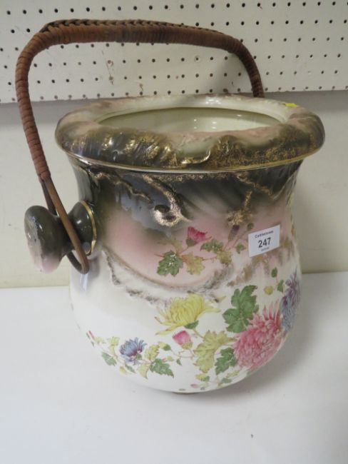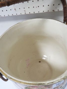 A VINTAGE CERAMIC DRAINING POT WITH WICKER WORK HANDLE