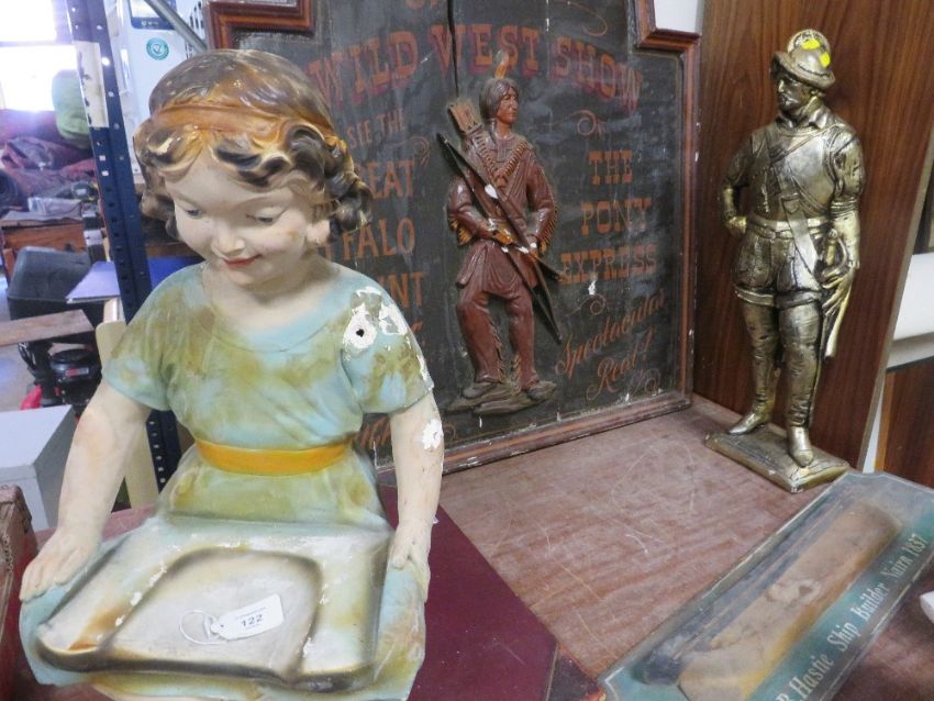 REPRODUCTION BUFFALO BILL SIGN, CHALK FIGURE OF A SEATED GIRL ETC A/F (4)