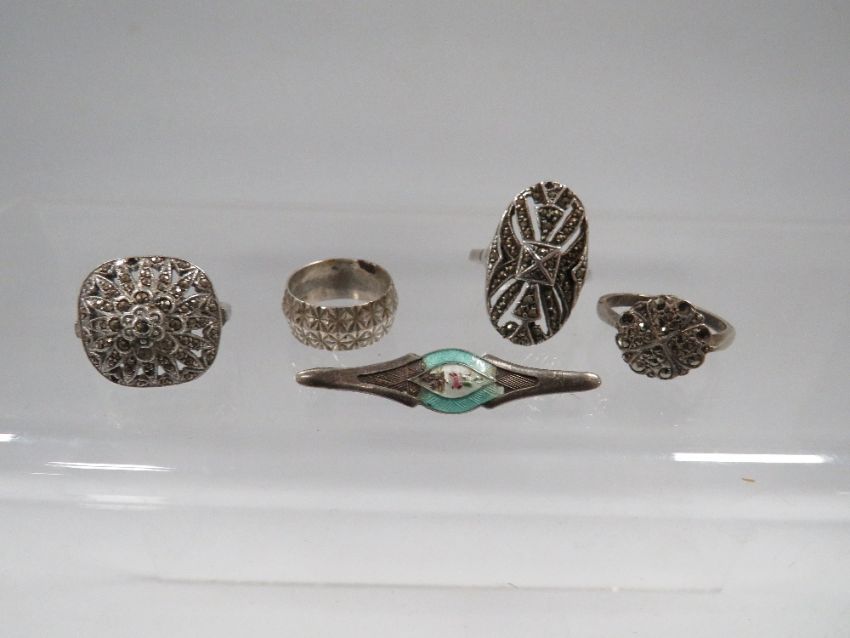 TWO LARGE ART-DECO SILVER MARCASITE RINGS TOGETHER WITH TWO OTHERS