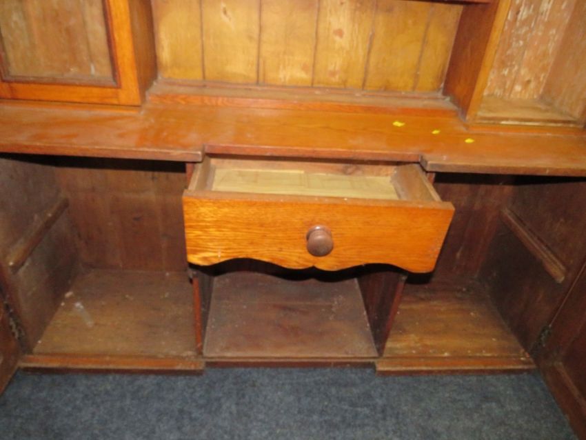 AN ANTIQUE OAK GLAZED KITCHEN DRESSER 196 X 152 CM