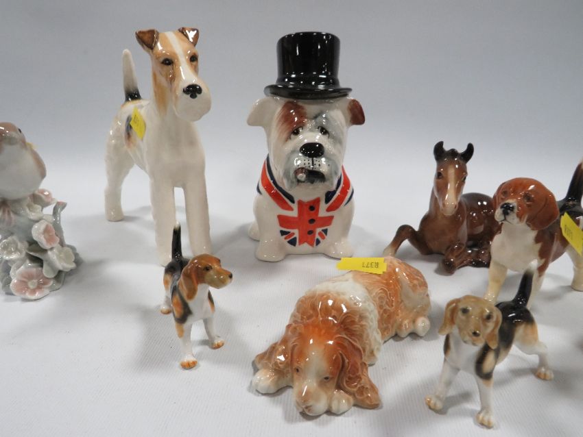 A COLLECTION OF ASSORTED FIGURES TO INCLUDE A MANOR COLLECTABLE'S FIGURE OF AN ENGLISH BULLDOG, BESWICK DOG, LLADRO BIRD ETC (9)