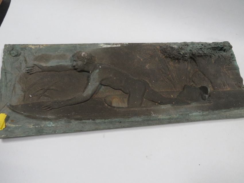 TWO CAST METAL PLAQUES OF MALE STUDIES IN CANOES
