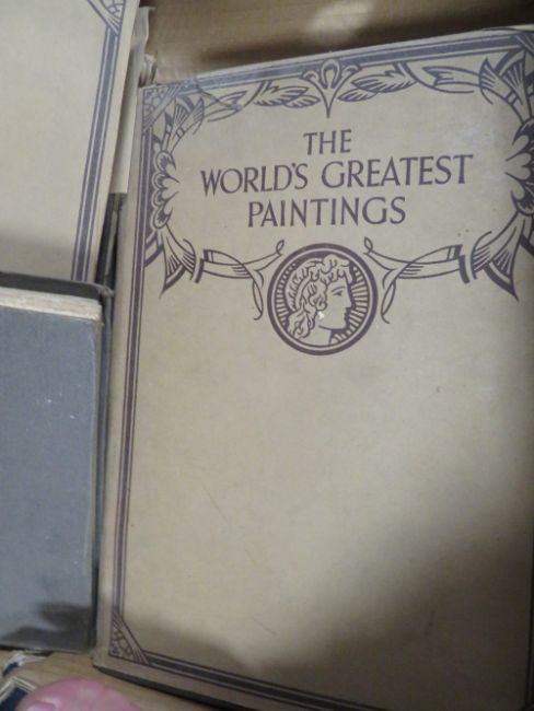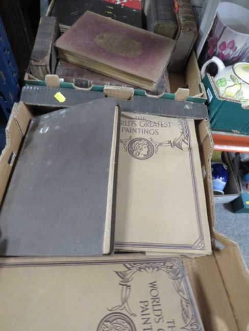 TWO TRAYS OF ANTIQUE BOOKS ETC TO THE INCLUDE THE WORLDS GREATEST PAINTINGS