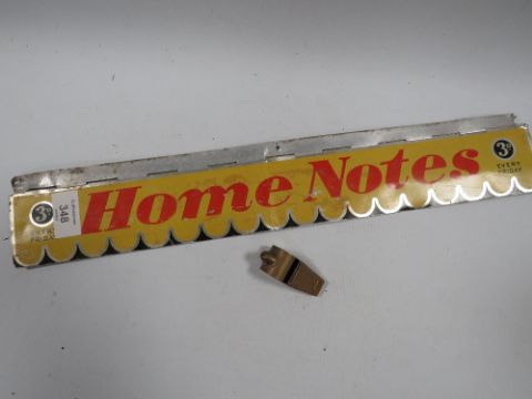 AN ADVERTISING HOME NOTES LETTER BOX STYLE COVER TOGETHER WITH AN ACME THUNDERER WHISTLE