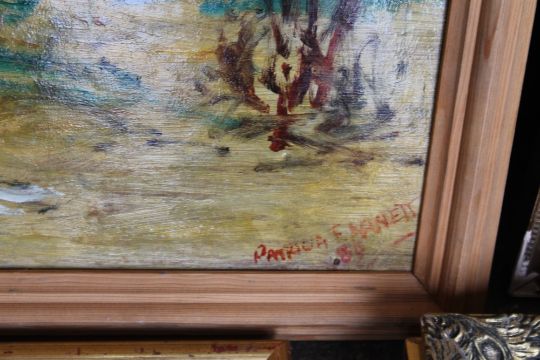 PATRICIA F. ARNETTE (1923) 'PIETA', OIL ON BOARD TOGETHER WITH TWO FURTHER OILS AND LINO CUT OF VENICE (4)
