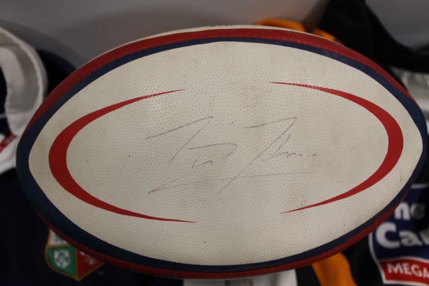 A COLLECTION OF RUGBY COLLECTABLE'S TO INCLUDE A BRITISH LIONS SHIRT NUMBER 13, A LEAGUE RUGBY SHIRT AND A SIGNED OFFICIAL ENGLAND RUGBY BALL WITH TWO AUTOGRAPHS